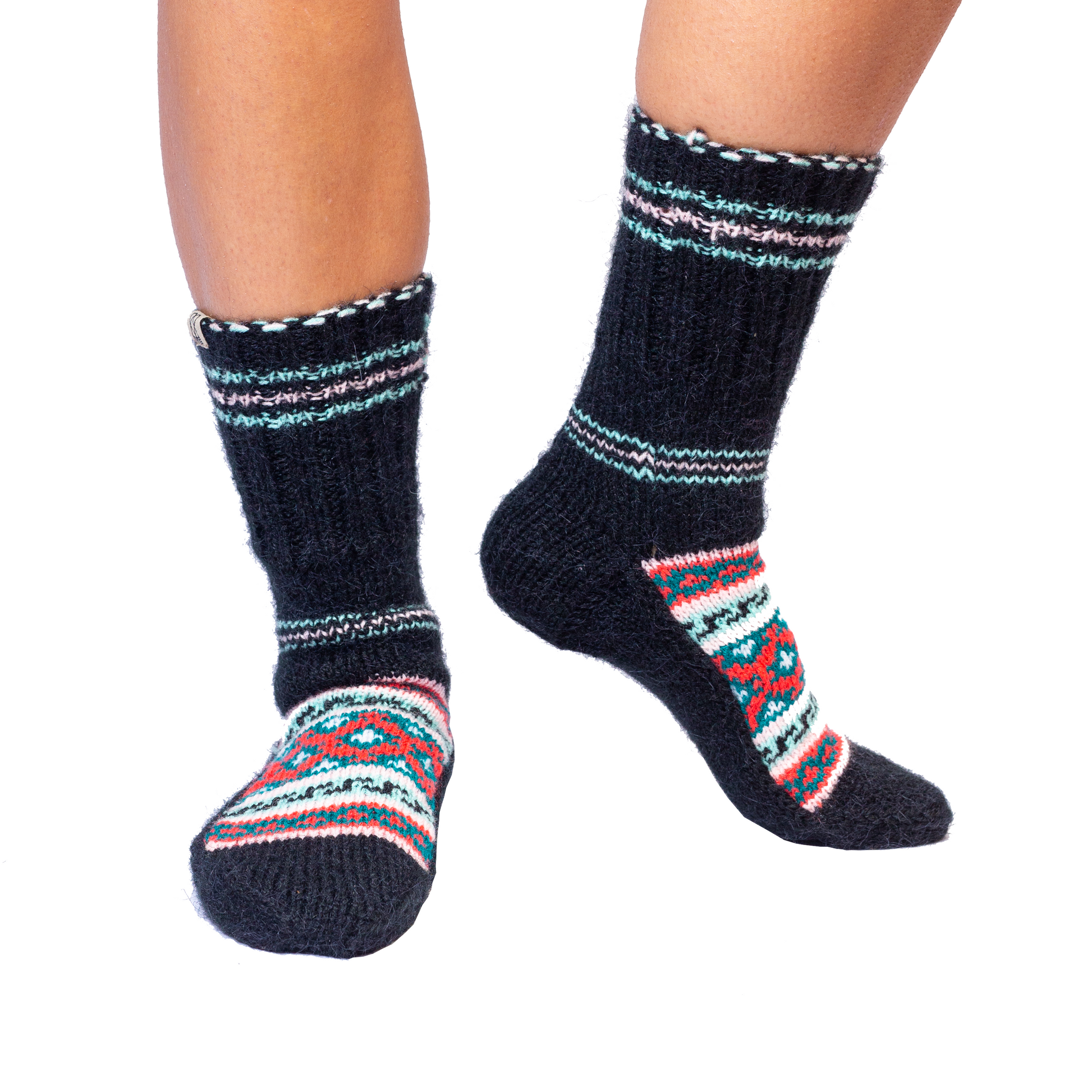 • The Raajasee Design – The Raajasee socks are black with coral, emerald green, and white details. They contain the traditional Himalayan patterns of jurra bumchack (joined x's) and lamree (z's), which are patterns that have existed in this community for centuries